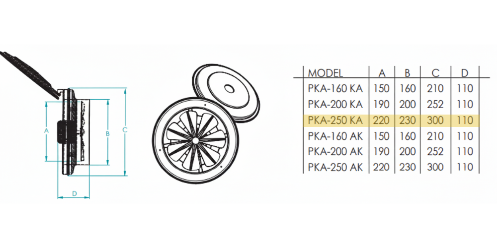 PKA-KA (Kapaklı) modeller, fan kapalıyken dış ortamdan gelebilecek rüzgâr, toz ve yabancı maddelerin iç ortama girişini önleyen kapak mekanizmasıyla öne çıkar.