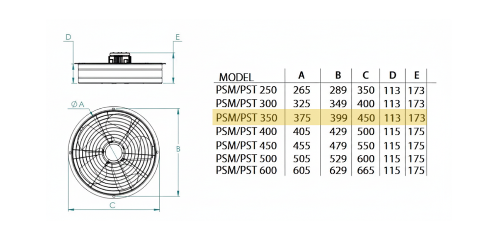 Fanexfan PSM 350 Aksiyal Sanayi Aspiratörü (Monofaze, 375 mm), endüstriyel alanlarda yüksek hava sirkülasyonu sağlamak amacıyla tasarlanmış, dayanıklı ve verimli bir havalandırma çözümüdür.